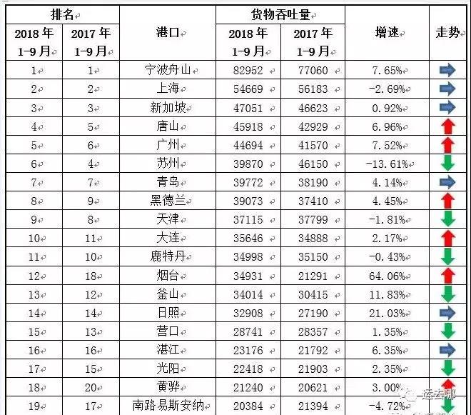 1-9月,货物吞吐量排在前十位的港口分别是:宁波舟山港(第1)、上海港(第2)、新加坡港(第3)、唐山港(第4)、广州港(第5)、苏州港(第6)、青岛港(第7)、黒德兰港(第8)、天津港(第9)、大连港(第10)。