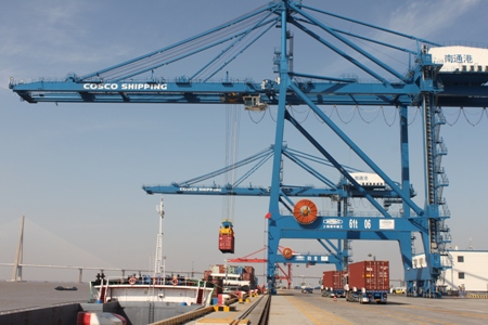 目前,南通港共建成各类码头泊位289个,其中10万吨级以上泊位29个,与世界上100多个国家和地区的300多个港口通航。同时,临港产业成为南通港的半壁江山,新能源、装备制造等产业集聚发展,海工产业规模居全国第二,海工装备占全国市场的三分之一,是国家重点建设的现代化大型船舶海工生产基地。依托港口,江海前沿区域创造了全市80%左右的GDP、70%以上的规模工业产值。今年6月30日,南通市与中远海运联袂打造的通海现代化集装箱港区一期工程开港,未来将成为沿江集装箱运输内贸枢纽中心、近洋集散中心、远洋分拨中心。