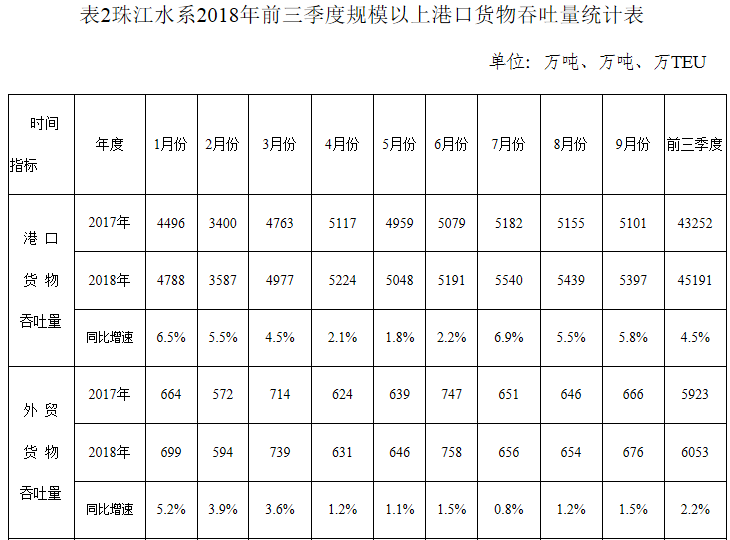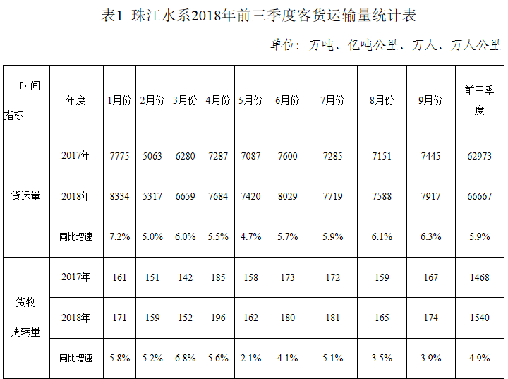 1.水路货运量持续较快增长。前三季度,珠江水系四省(自治区)经济形势稳中向好,工业生产保持中高速增长,大宗散货运输需求持续旺盛,煤炭、矿建材料、水泥(含熟料)内河运量同比分别增长8.2%、9.3%、8.8%,为内河货运量、货运周转量增速较快的直接原因。