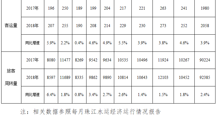 今年以来,珠江水运加快发展,客货运输量稳步提升。前三季度完成货运量、货物周转量分别为66667万吨、1540亿吨公里,同比分别增长5.9%、4.9%;客运量和旅客周转量分别为2058万人、92385万人公里,同比分别增长3.9%、2.4%。具体各月数据变化详见表1。