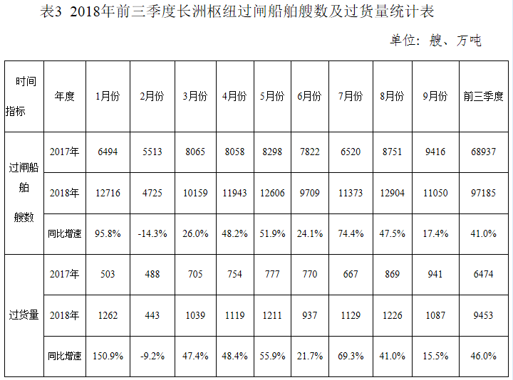 3.过闸货物通过量高速增长。前三季度,长洲枢纽船闸货物通过量9453万吨,同比增长46.0%。受市场需求影响,上航过闸货物中砂的运量减少较快,其他过闸货物货种结构变化不大。上航货物以煤炭和粮食作物为主,主要有原煤、玉米、集装箱、非金属矿石等,约占上航货物总量的70%;下航货物以建筑用料为主,主要有水泥及水泥熟料、石料、钢材、鹅卵石、集装箱等,约占下航货物总量的80%。