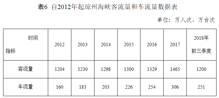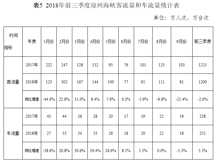 2018年前三季度,琼州海峡客滚运输继续平稳有序,广东、广西进出海南岛实际客流量1200万人次,车流量251 万台次,实航39184航次。2018年前三季度琼州海峡客滚运输情况详见表5。