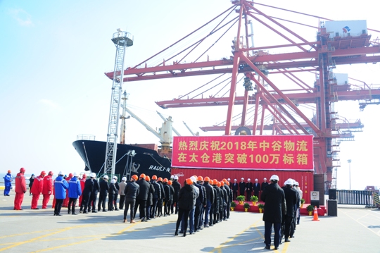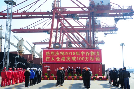 2018年12月29日,一个覆盖着“热烈庆祝2018年中谷物流在太仓港突破100万标箱”横幅的集装箱被缓缓吊起,这是2018年中谷物流在太仓港的第100万个标箱,中谷物流因此成为了首家在太仓港年吞吐量突破100万标箱的民营船公司,这是重要的转折点,也是崭新的起点。