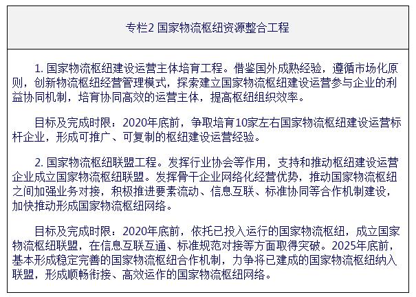 到2020年,通过优化整合、功能提升,布局建设30个左右辐射带动能力较强、现代化运作水平较高、互联衔接紧密的国家物流枢纽,促进区域内和跨区域物流活动组织化、规模化运行,培育形成一批资源整合能力强、运营模式先进的枢纽运营企业,初步建立符合我国国情的枢纽建设运行模式,形成国家物流枢纽网络基本框架。