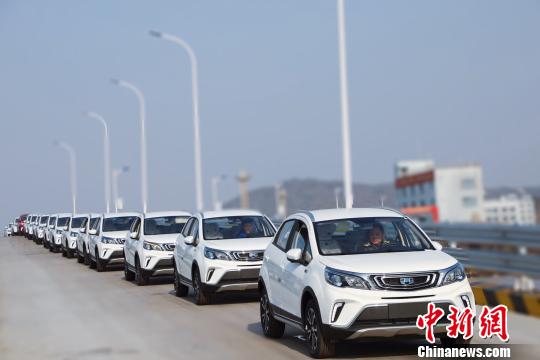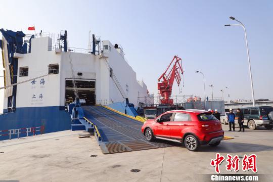 中新网台州1月18日电(见习记者 范宇斌)18日,浙江台州临海头门港滚装码头举行头门港吉利汽车滚装运输首航仪式。8款车型的400辆国产吉利汽车通过“世海”号滚装运输船,将途径山东烟台,最终到达辽宁大连。