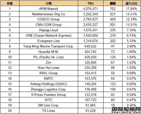 Alphaliner最新运力数据显示,截止2019年2月10日,全球班轮公司运力100强中排名前三的分别是马士基航运、地中海航运和中远海运集运。第四名到第十名依次为:达飞轮船、赫伯罗特、日本神运、长荣海运、阳明海运、现代商船和太平船务,全球班轮公司运力排名20的公司总运力为2025.12万TEU,占全球集装箱总运力的88.64%。