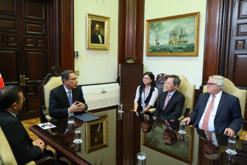 在签约仪式前,秘鲁总统比斯卡拉会见了许立荣等一行。比斯卡拉对中远海运在秘鲁的投资表示感谢和欢迎,他高度评价道,钱凯港口项目不仅对中秘两国企业有利,同时也有利于中秘两国经贸合作。在项目后续的推进中,秘鲁政府将给予全力支持。秘鲁外交部长波波利西奥、火山矿业主席何塞?毕加索,中远海运集团战企部、公关部以及中远海运港口有关负责人陪同出席了会见活动。