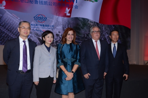 当天晚上,中远海运还在秘鲁举行了中远海运港口秘鲁钱凯公司市场推介会。秘鲁副总统梅赛德斯?阿劳斯、中国驻秘鲁大使馆临时代办李昀、火山矿业主席何塞?毕加索、中远海运港口主席兼董事总经理张为等出席了推介会。