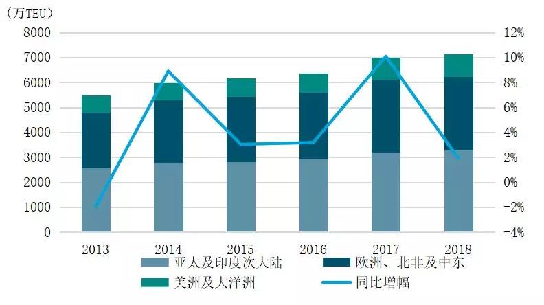 迪拜环球集团业绩大幅下降。2018年,迪拜环球共处理集装箱吞吐量7141.9万TEU,同比增速1.91%,较去年下滑8.17个百分点。究其原因,主要是集团在2017年入股韩国釜山港码头带来的直接增量效应消失,同时,集团为巩固盈利缩减了低利润的码头业务。分区域来看,受益于加拿大鲁珀特王子港扩建工程的建成投产所带来的效益,集团在美洲及大洋洲板块保持2.75%的正增长。而由于集团削减了阿联酋的低利润业务,导致中东地区业绩表现疲软,欧洲、北非及中东板块增幅仅为0.4%。