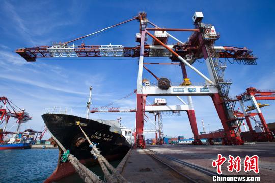中新网威海8月21日电 (王娇妮 林雁)21日,在威海港集团青威集装箱码头巨大的钢铁矩阵上,起重机来回穿梭于集装箱区和岸边,一片繁忙的港口作业景象。