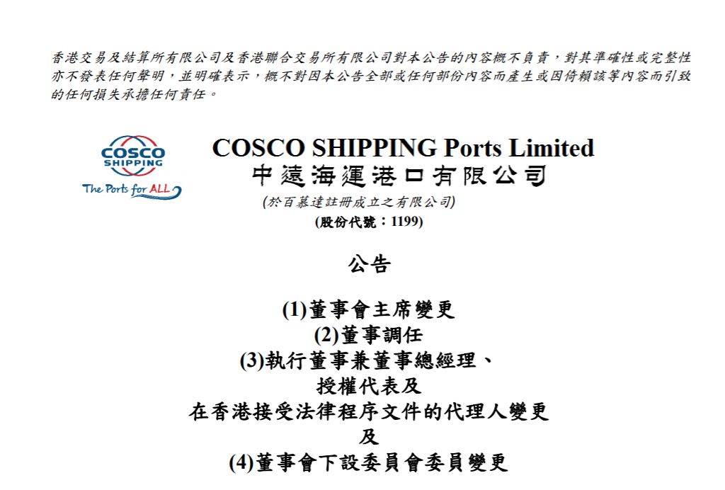 中远海运港口非执行董事冯波鸣调任为执行董事,并获委任为董事会主席、授权代表、传票代理人、执行委员会及投资及战略规划委员会主席,及提名委员会及薪酬委员会委员;