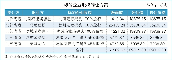 截至10月17日,北部湾港务集团直接与间接持有北部湾港11.23亿股股份,占总股本的68.72%,本次交易对象包括北部湾港务集团持有的北海宏港码头有限公司(北海宏港码头)100%股权、防城港务集团有限公司(防城港务集团)所持有的防城港雄港码头有限公司(防城港雄港码头)100%股权、防城港云约江码头有限公司(防城港云约江码头)55%股权和广西北港建设开发有限公司(北港建设)所持有的广西钦州保税港区宏港码头有限公司(钦州宏港码头)100%股权,其中防城港务集团、北港建设均为北部湾港务集团100%控股的下属企业。同时,北部湾港还将收购由广西盛隆冶金有限公司(盛隆冶金)持有的防城港云约江码头45%股权。本次交易完成后,北部湾港将持有北海宏港码头100%股权、防城港雄港码头100%股权、防城港云约江码头100%股权、钦州宏港码头100%股权。本次交易涉及金额89319.03万元(见表)。