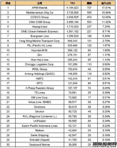 排名第11至20名依次为:以星航运、万海航运、中谷海运、伊朗国航(IRISL)、安通控股、高丽海运(KMTC)、海丰国际、X-Press Feeders Group、德翔海运、森罗商船。