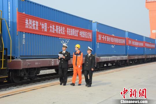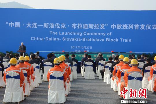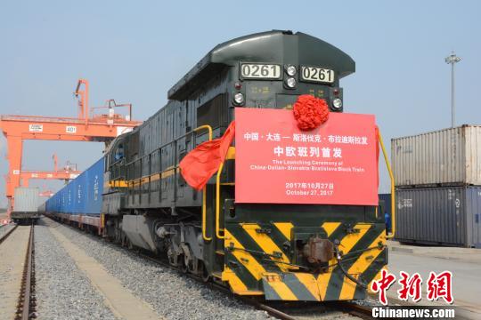 中新网大连10月27日电 (记者 杨毅)27日10时38分,装载着来自中国华东、华北以及东北等地区总货值超过300万美元产品的“中国大连—斯洛伐克布拉迪斯拉发”集装箱班列从大连港准时开行,标志着中国首条直达斯洛伐克中欧班列正式开通。