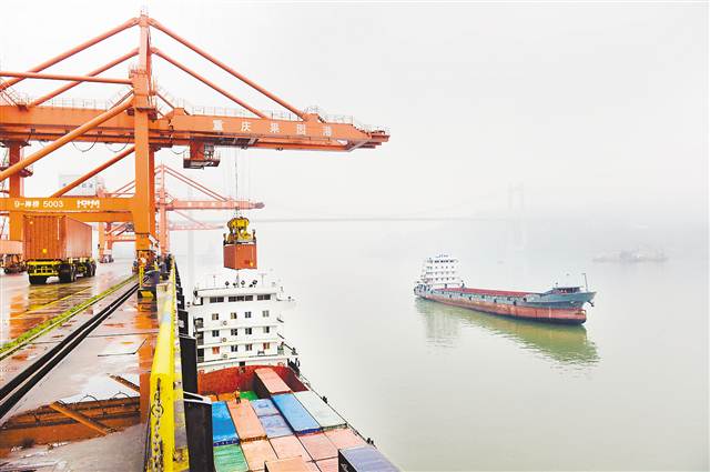 重庆市交通委员会 张锦辉 近日,两江新区果园港码头,集装箱船正在装货。