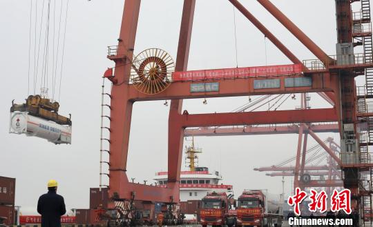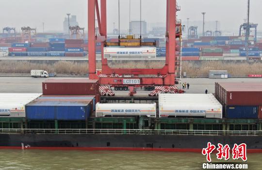 中新网南京1月3日电(记者 申冉)3日,搭载着24个液化天然气(下称LNG)罐式集装箱(下称罐箱)的“建功9”轮在南京龙潭港完成卸载,此举标志着中国第一次LNG罐箱江海联运试点工作圆满成功,这也为中国打通LNG运输“最后一公里”、打造LNG“海进江”新通道提供了有益的尝试,有助于加快实施“气化长江”、助力长江经济带绿色发展。