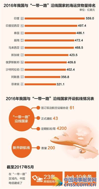 据统计,通过73个公路和水路口岸,中国与相关国家开通了356条国际道路客货运输线路;海上运输服务已覆盖“一带一路”沿线所有国家;与43个沿线国家实现空中直航,每周约4200个航班;简化了国际铁路联运办理手续,促进中欧间国际铁路货物联运,开展国际铁路运邮合作。