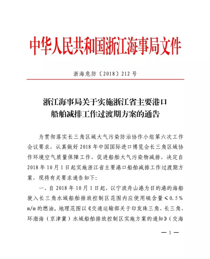 一、自2018年10月1日起,以宁波舟山港为目的港的海船驶入长三角水域船舶排放控制区范围内应使用硫含量≤0.5%m/m的燃油。地理范围以《交通运输部关于印发珠三角、长三角、环渤海(京津冀)水域船舶排放控制区实施方案的通知》(交海发〔2015〕177号)为准,详见附件。