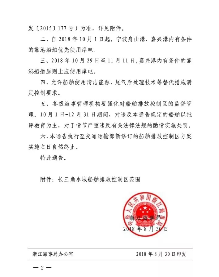 二、自 2018 年 10 月 1 日起,宁波舟山港、嘉兴港内有条件的靠港船舶优先使用岸电。