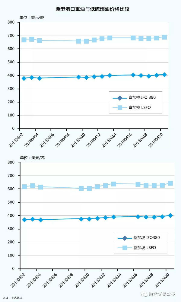 未来,低硫燃油的价格也将更有优势。当下,重油与低硫燃油的成本差已经呈现逐渐缩小的趋势,从富加拉和新加坡港口燃料油价格在2018年4月的变化便可看出端倪。4月20日,富加拉IFO 380价格为408美元/吨,LSFO为690美元/吨,价差282美元/吨;而在月初,富加拉IFO 380为380美元/吨,但LSFO为670美元/吨,价差290美元/吨。新加坡此种趋势更明显,4月份新加坡IFO 380价格涨幅超8%,而LSFO涨幅仅4%(见图)。在环保投资趋势下,石油供应商也会考虑让渡部分利益,便于其迅速推广低硫燃料。
