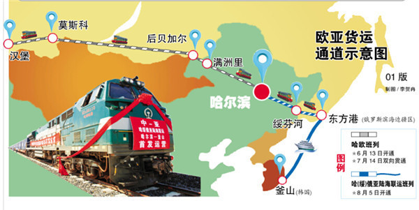 为深入贯彻落实国家“一带一路”战略,我省发挥自身区位优势,积极推动“中蒙俄经济走廊”建设,开通了哈尔滨经满洲里口岸到莫斯科和欧洲腹地的哈(满)俄欧货运班列。通过与俄罗斯远东港口群合作,此次我省开行哈(绥)俄亚陆海联运航线,从而深入开展与韩国、日本的东北亚区域合作,扩大内贸货物跨境运输规模。据悉,该班列将通过铁路经绥芬河口岸到达俄罗斯滨海边疆区东方港,再由海运到达终点韩国釜山。该条通道开通后将与哈欧货运通道贯通,形成西接欧洲、东接东北亚乃至北美地区的高速运输通道。