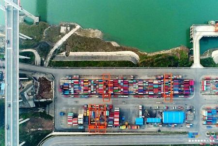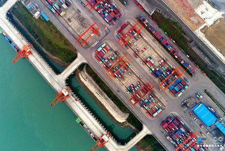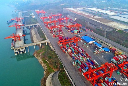 新华网 2017年政府工作报告指出,要进一步完善对外开放战略布局,加快构建开放型经济新体制,推动更深层次更高水平的对外开放。重庆果园港,是我国内河上“水、铁、公”联运物流枢纽港,凭借多式联运的优势,重庆果园港中转和辐射力正在显现,已成为连接“一带一路”和长江经济带的重要节点。新华网发伍北海 摄